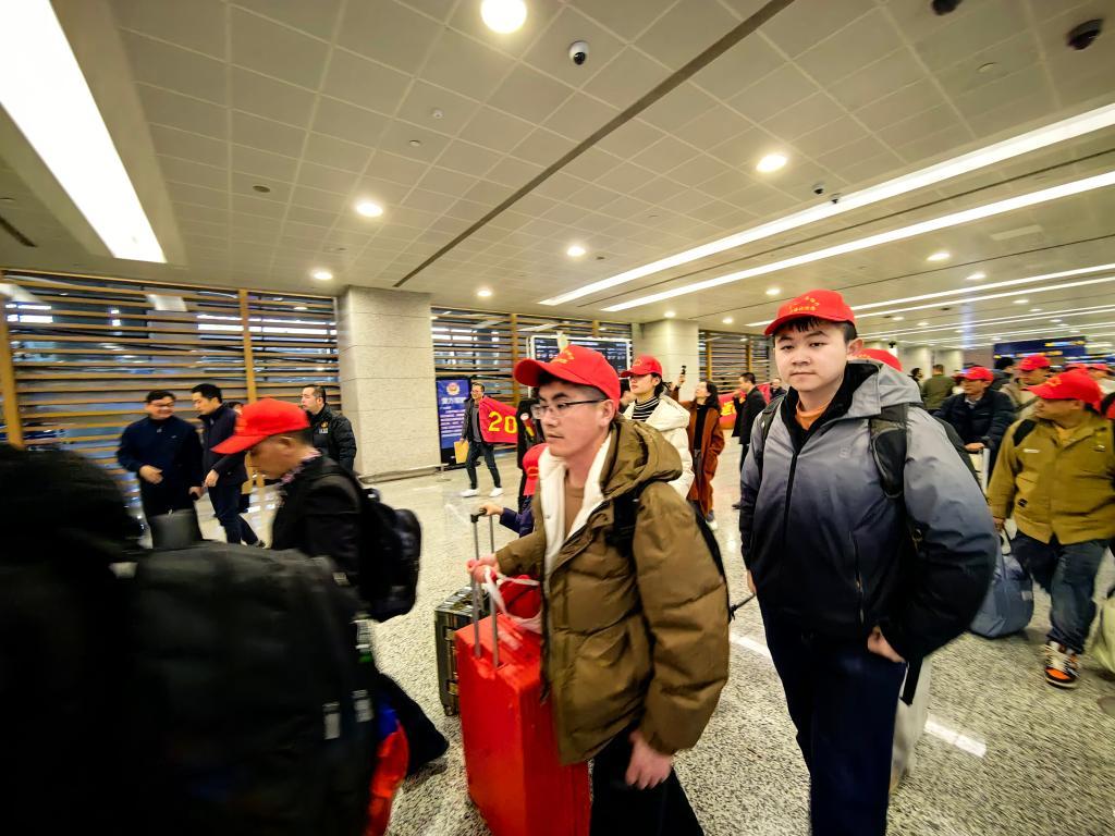 大年初四下午,一架载有来自云南文山、红河等地100名来沪务工劳动者的飞机,顺利抵达上海浦东国际机场。这些头戴“小红帽”的劳动者们取完行李,接过上海人社部门工作人员的新春礼包,坐上接机大巴,一路到达企业后将快速复工。他们也是蛇年春节假期上海首批“点对点”返岗的来沪务工劳动者。