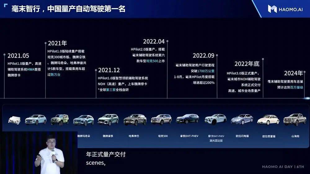 张凯说,那一年他们做得非常辛苦,很多人经常加班到很晚,可以用没日没夜来形容。终于,他们用了一年的时间,把HPliot1.0做出来了。2021年4月,搭载HPliot1.0的魏牌摩卡在上海车展宣布预售,这也标志着毫末智能驾驶技术的首次量产落地。