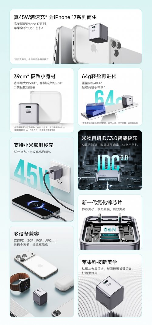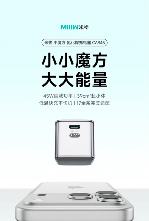 近日,小米生态链核心品牌米物科技正式推出新品小魔方45W氮化镓充电器。这款集便携设计、强悍性能与智能安全于一体的快充设备,凭借“核桃般超小体×45W满功率输出”的核心优势,精准解决iPhone官方不配充电器的痛点,为iPhone 17全系、轻薄本及多品牌数码设备用户带来全新充电解决方案。