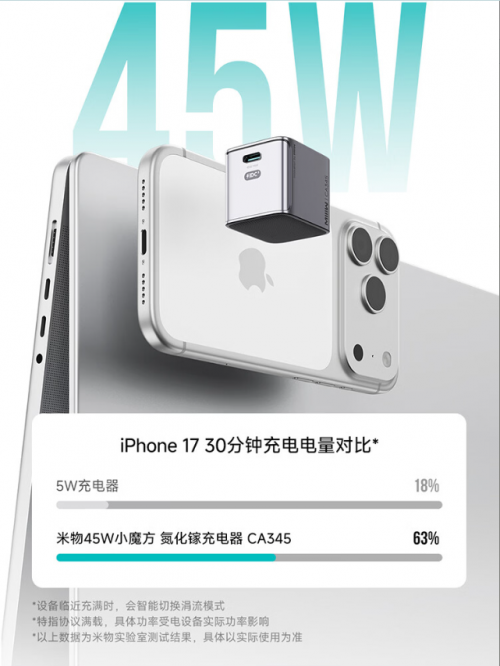 性能表现上,新品实现了核心突破——45W满载持续输出不降档,性能超越了市面上的同规格产品。有知名KOL评测结果显示,用负载仪测试45W满功率,连续48小时依旧满功率不降档,稳稳当当!实测数据显示,其可为iPhone 17系列提供极速快充,半小时即可充入约63%电量,同时还支持小米私有协议,能激活45W澎湃秒充,为米系机型带来原厂级快充体验。