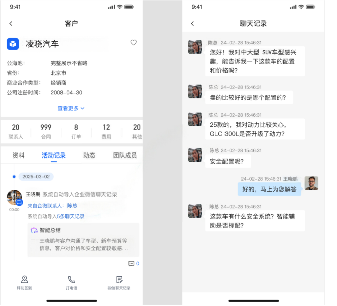 小王点开企微侧边栏查看客户画像、标签,发现陈先生名下已有轿车、SUV 两款油车,且对价格不敏感;结合沟通内容,他立刻判断出客户的核心需求是置换旧油车、升级新能源车。于是,小王针对性推荐了一款新上市的高端新能源 SUV,同时发送详细的油车置换补贴政策,精准戳中客户痛点。