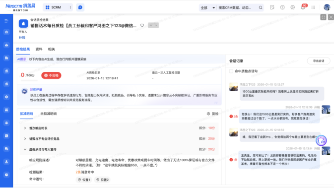 对门店管理层而言,企微会话质检功能则提供了一种全面高效的管理方式。系统不再依赖传统低效的人工随机抽检,而是通过全量覆盖的规则校验,对每一通销售与客户的企微会话进行自动化合规性扫描。
