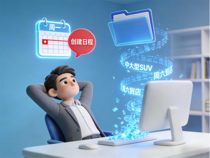 此外,小王无需手动录入,企微会话 Agent 智能总结对话,要点清晰、重点突出,并在系统中沉淀为跟进记录。小王识别到了“周六到店”等关键信息后快速创建了日程。这种自动化流程减少了销售人员的案头工作,帮助销售聚焦真正有购买意向、有到店意愿的高潜客户,让小王在工作效率和签单率上双双跃升。