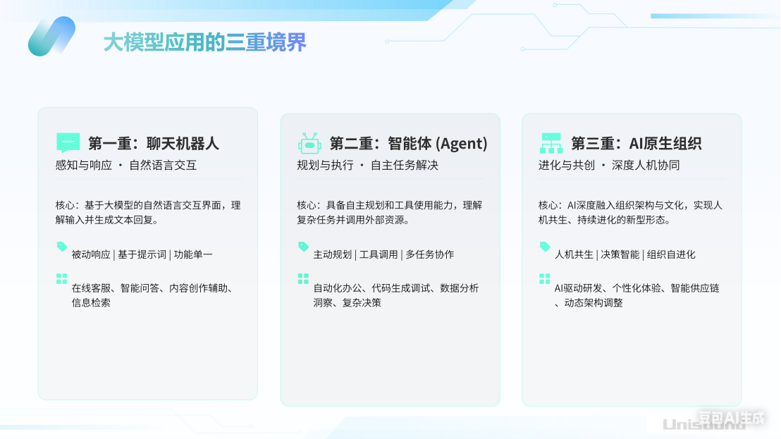 观点四:企业AI应用有三重境界,从“能说”到“会做”再到组织重构