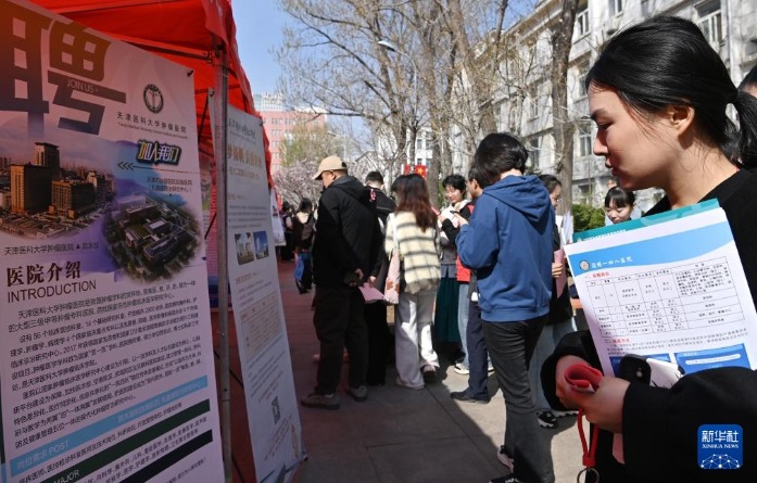当日,天津医科大学2024届毕业生春季专场招聘会在学校世纪大道举行。据了解,来自全国10余个省市的约300家医疗卫生单位带来了数千个就业岗位供毕业生选择。