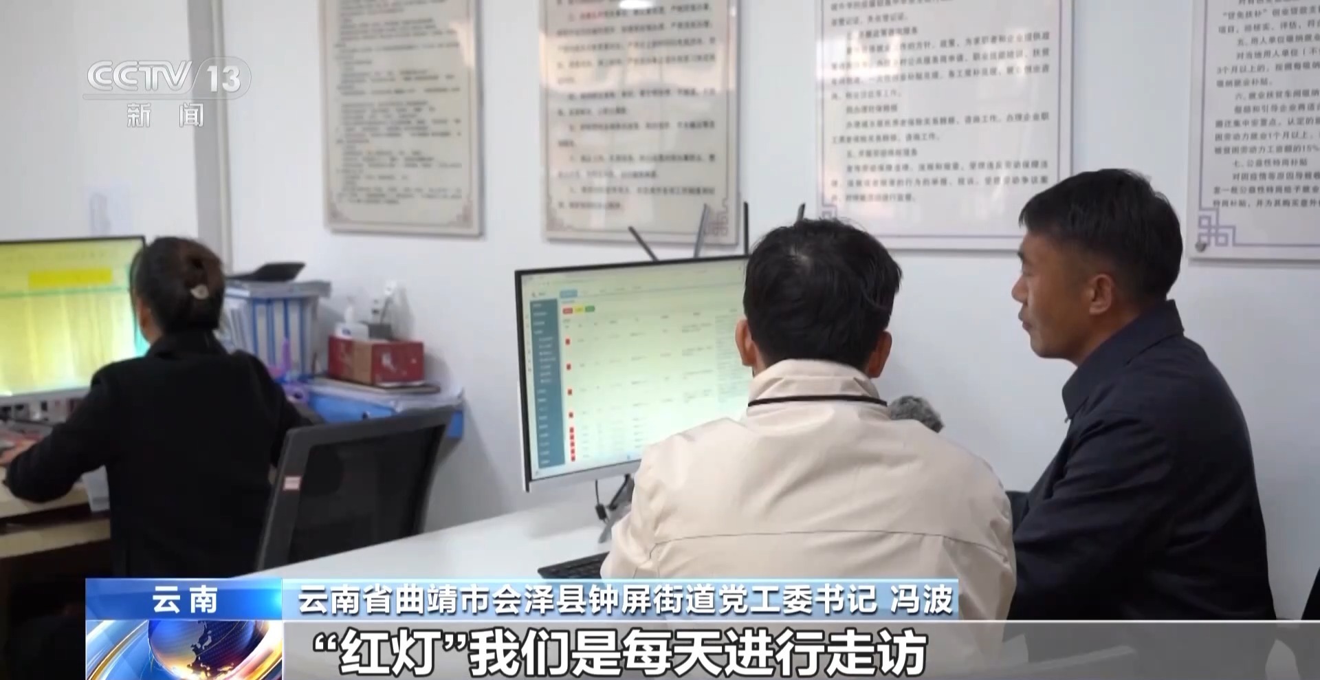 云南省曲靖市会泽县钟屏街道党工委书记 冯波:“红灯”我们是每天进行走访,“黄灯”我们是每周走访,“绿灯”是每个月进行动态更新信息。每天走访的方式一个是入户,另外一个通过手机信息进行跟踪,掌握情况。