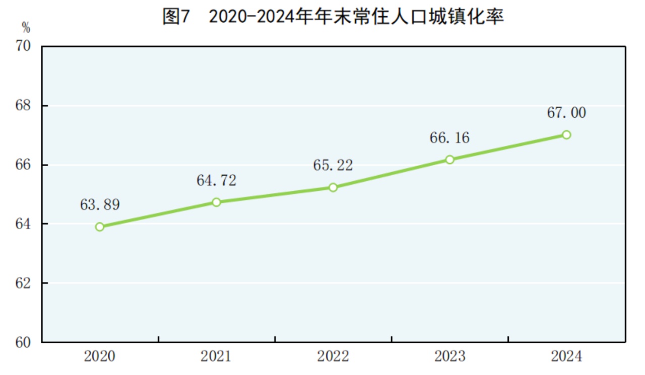 城乡融合和区域协调发展扎实推进。年末全国常住人口城镇化率为67%,比上年末提高0.84个百分点。