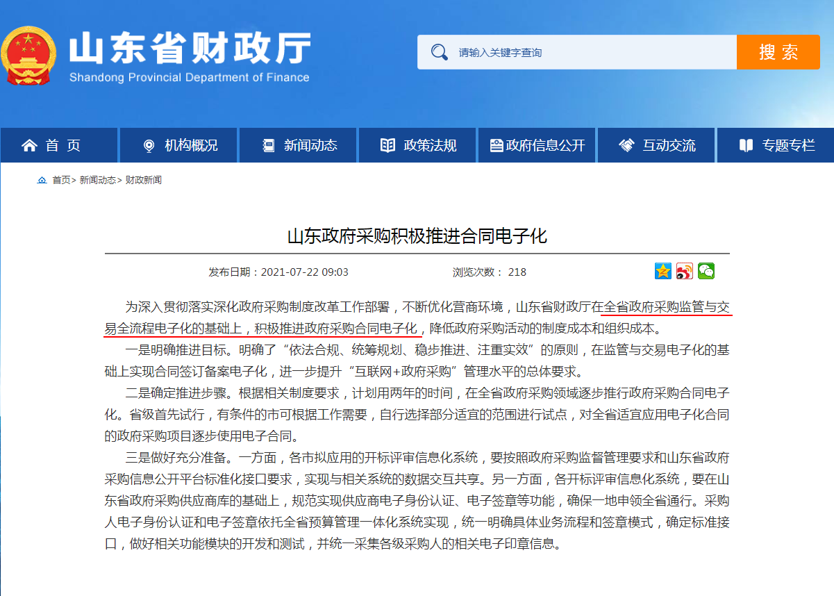 7月,山东省财政厅也引发了《关于推进政府采购合同电子化的通知》(以下简称《通知》),明确要在全省政府采购监管与交易全流程电子化的基础上,积极推进政府采购合同电子化,降低政府采购活动的制度成本和组织成本。
