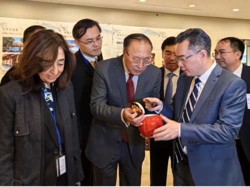 时任中国常驻联合国代表张军(中)等嘉宾在联合国总部听取国家级非遗传承人、八马茶业董事长王文礼(右二)介绍八马东湖之光·赛珍珠