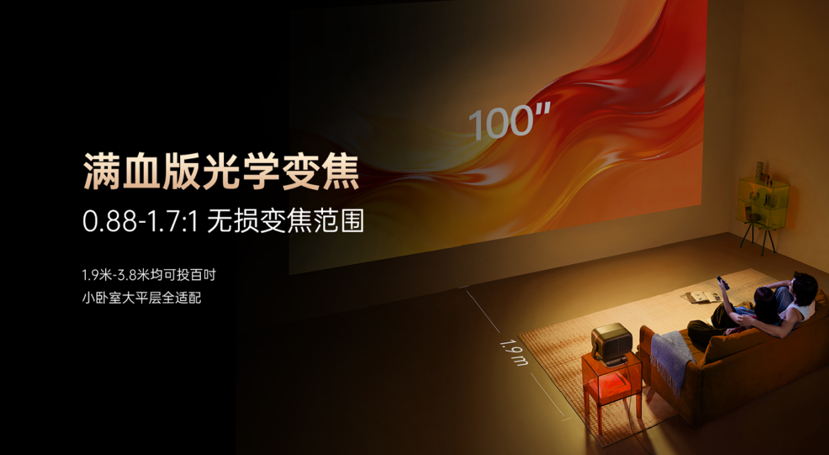而投影仪的适配效果,核心取决于“分辨率无损-变焦无损”与“分辨率无损-移轴无损”两大标准。先看“分辨率无损-变焦无损”:核心逻辑是投影画面分辨率是否损耗,取决于“投影距离”与“镜头变焦能力”的匹配度。结合80%家庭房间纵深3.3-4.2米的数据,扣除投影仪机身摆放预留(0.3米左右)、观影距离(100寸画面建议2.5-3.5米)等因素,实际可摆放的“墙面距离”为2.0-3.7米。在此区间内,配备光学变焦范围在1.2:1及以上标准镜头变焦比的主流家用投影仪,无需依赖易损耗分辨率的“数字变焦”,仅通过“光学变焦”即可轻松投射100 寸画面,实现分辨率与变焦双无损,覆盖多数家庭客厅、卧室的高清观影需求。