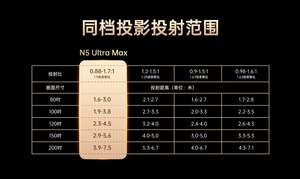 在符合上述适配标准的产品中,坚果N5 Ultra Max展现出出色的场景适配能力,其搭载的满血版双向移轴可覆盖91.5%家庭墙面范围,配合0.88-1.7:1的无损光学变焦,1.9米-3.8米距离内均可投射100寸画面,无论是3.3米左右的小卧室,还是4.2米以上的大客厅,都能在保证分辨率、亮度无损耗的前提下,呈现清晰细腻的巨幕效果,为不同户型的中国家庭提供了优质的观影选择。