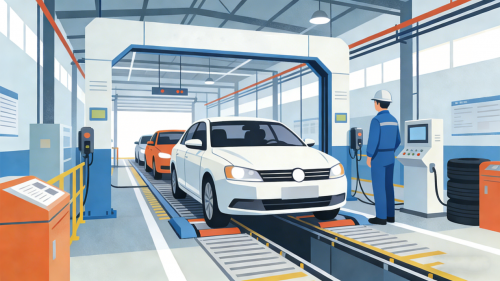 某大型汽车检测集团标杆站点内,一幅高效的画面正在上演:车辆正安静地通过一条全自动化的检测线,没有来回奔波的身影,没有嘈杂的喊叫,一切井然有序……