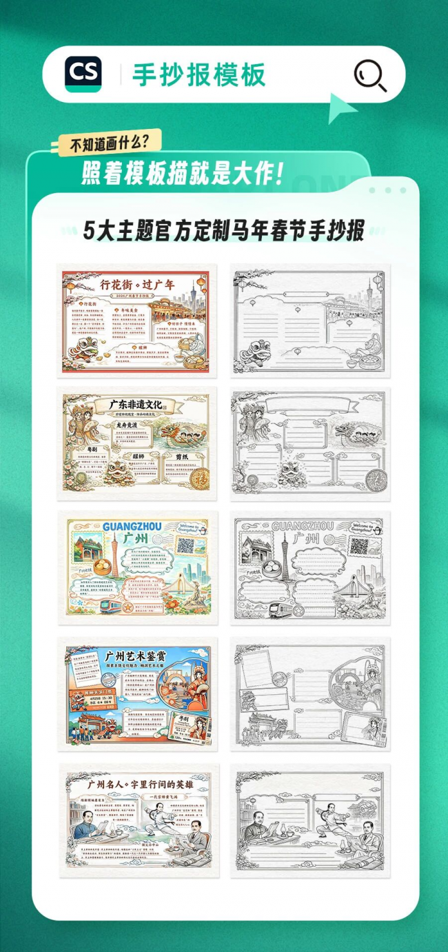对于多数缺乏绘画基础的孩子和家长而言,手抄报的第一步——构图与图案设计就难住了不少人。扫描全能王直击“不会画”的核心痛点,上线 5 大主题官方定制马年春节手抄报模板,涵盖春节民俗、非遗文化、国漫英雄、祖国河山、艺术活动等主流方向,完美匹配学校作业对“文化感”“创意性”的要求。用户只需打开这款扫描 App,搜索关键词“手抄报模板”,即可一键下载高清模板,打印后让孩子直接涂色、添加文字,很快就能完成基础创作,无需再在网上漫无目的地寻找素材,彻底降低创作门槛。