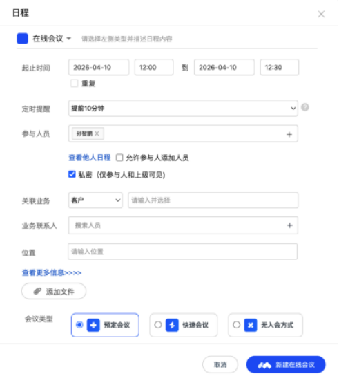 销售易CRM与腾讯会议整合方案下,业务人员可在客户日程中点击“发起会议”,系统自动生成专属入会链接,并根据CRM中的客户联系方式,一键推送会议通知并同步至参会人员日历。同时,它为每一位受邀人生成了唯一身份标识的入会链接——无论对方用微信个人号还是企业账号登录,系统都能精准识别。